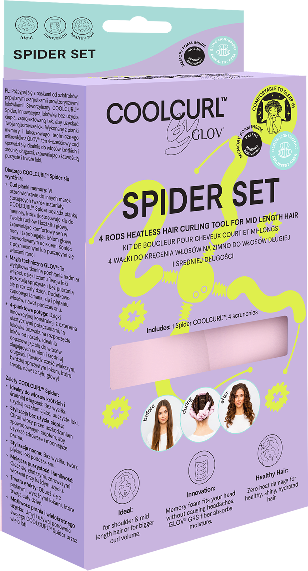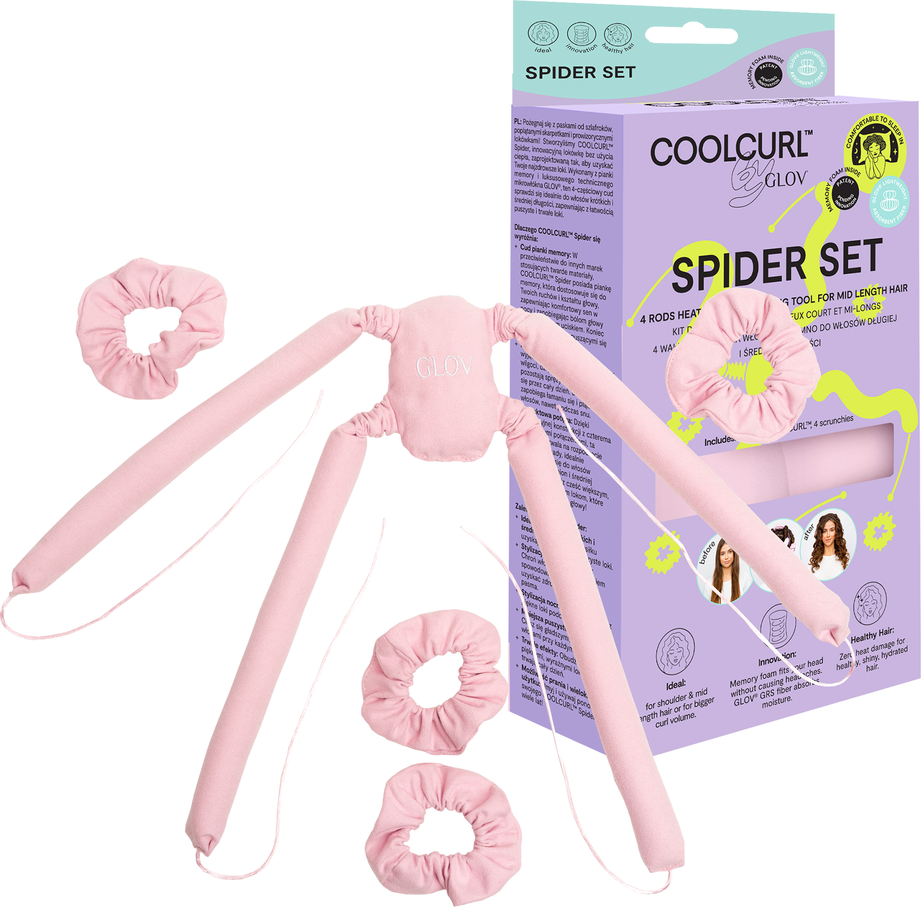 The optimised design of the COOLCURL™ Spider allows you to create heatless curls easily. It is specially designed for shorter and thinner hair. The memory foam core is hair-friendly and super comfortable to sleep in because it adapts to the shape of your head and keeps the hair in place while you sleep. The comfortable microfibres that enclose the memory foam core are particularly gentle on the hair and counteract frizz and unwanted hair breakage.