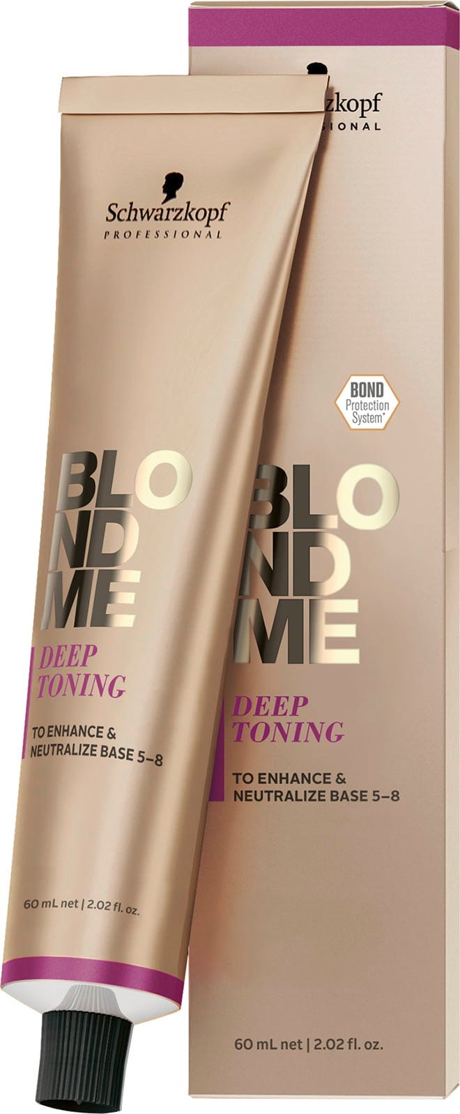 Are you looking for the essential final step to perfect blonde results? The Schwarzkopf Professional BLONDME Deep Toning range is the essential toning option for bases 5 to 8. It is designed for lightened hair with a colour depth of 5 to 8 and is not intended to lighten, but to neutralise bold red/gold pigments and create trendy lowlights and rich, deep blonde tones (Brond).