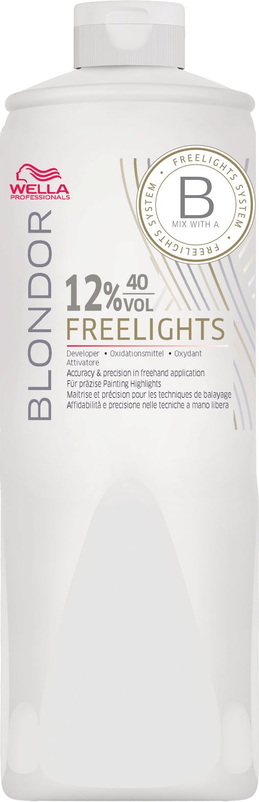 The Freelights product line allows you to unleash your creativity. They are ideal for freehand techniques thanks to their accuracy in depositing product. This developer can be used on natural or pre-colour-treated hair. It is formulated with hydrogen peroxide and flexible acrylic polymers.
